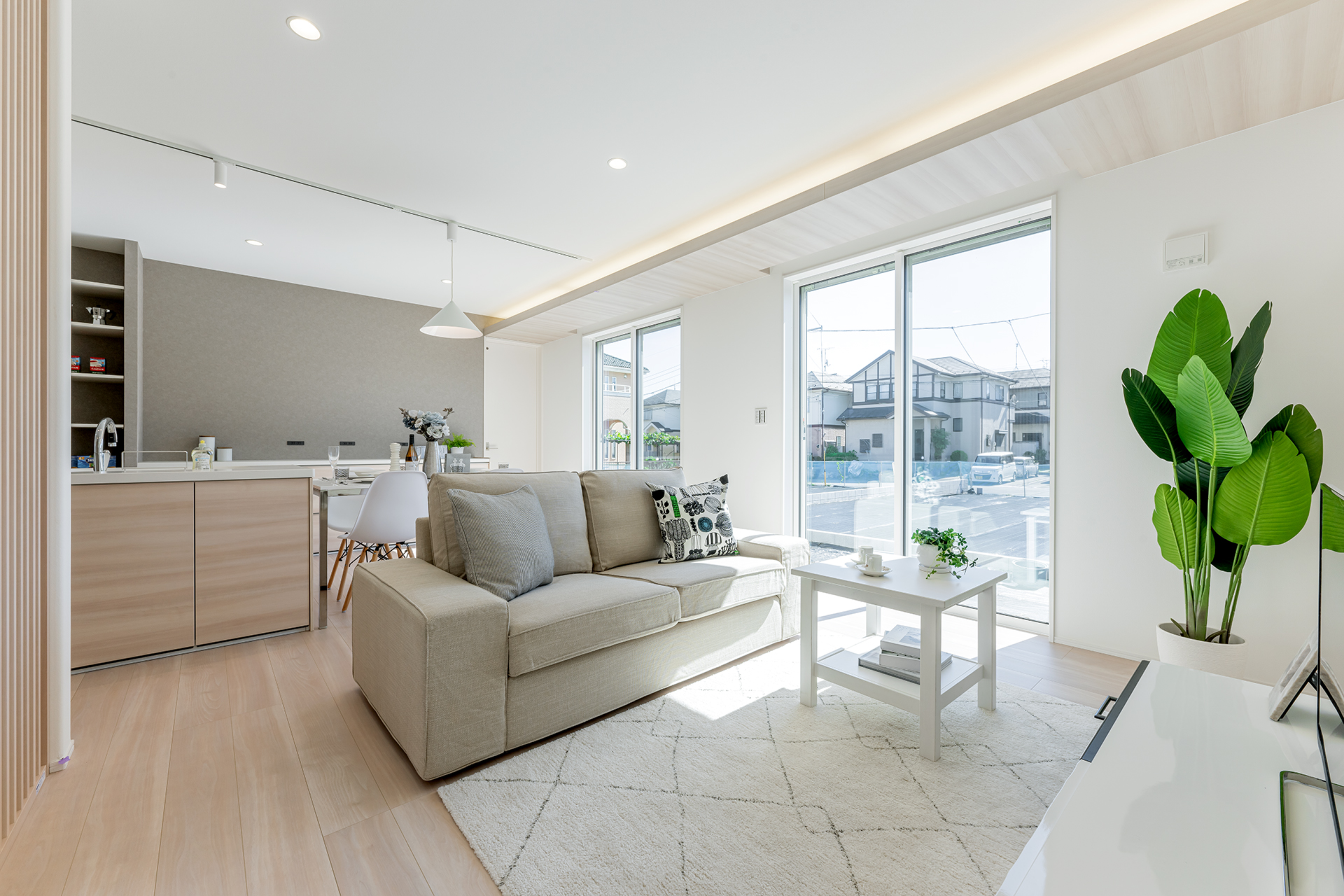 木の温かみが心地よい2階リビング。大きな窓から差し込むやわらかな陽光が、家族の時間をあたたかく包み込みます。