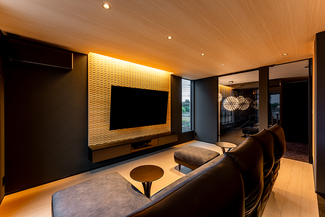 間接照明のふんわりとした光が空間を包み込み、家族団らんの憩いのリビングに。