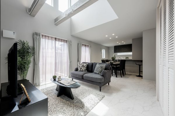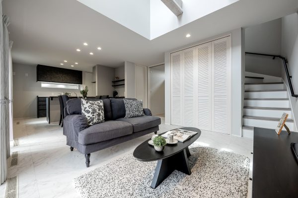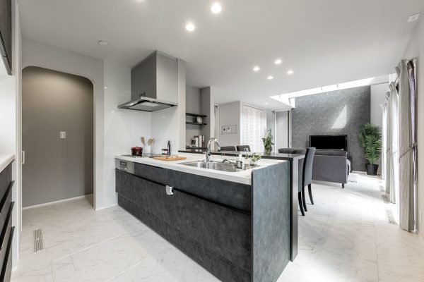 クールな印象の石目調のフローリングやソフトグレーの建具、モノトーンの壁紙などを用い、インテリアカラーを白・黒・グレーでまとめました。化粧梁にもグレーのクロスを貼り、モダンな雰囲気で統一。かっこよさの中にも柔らかさを感じるカラーコーディネートです。