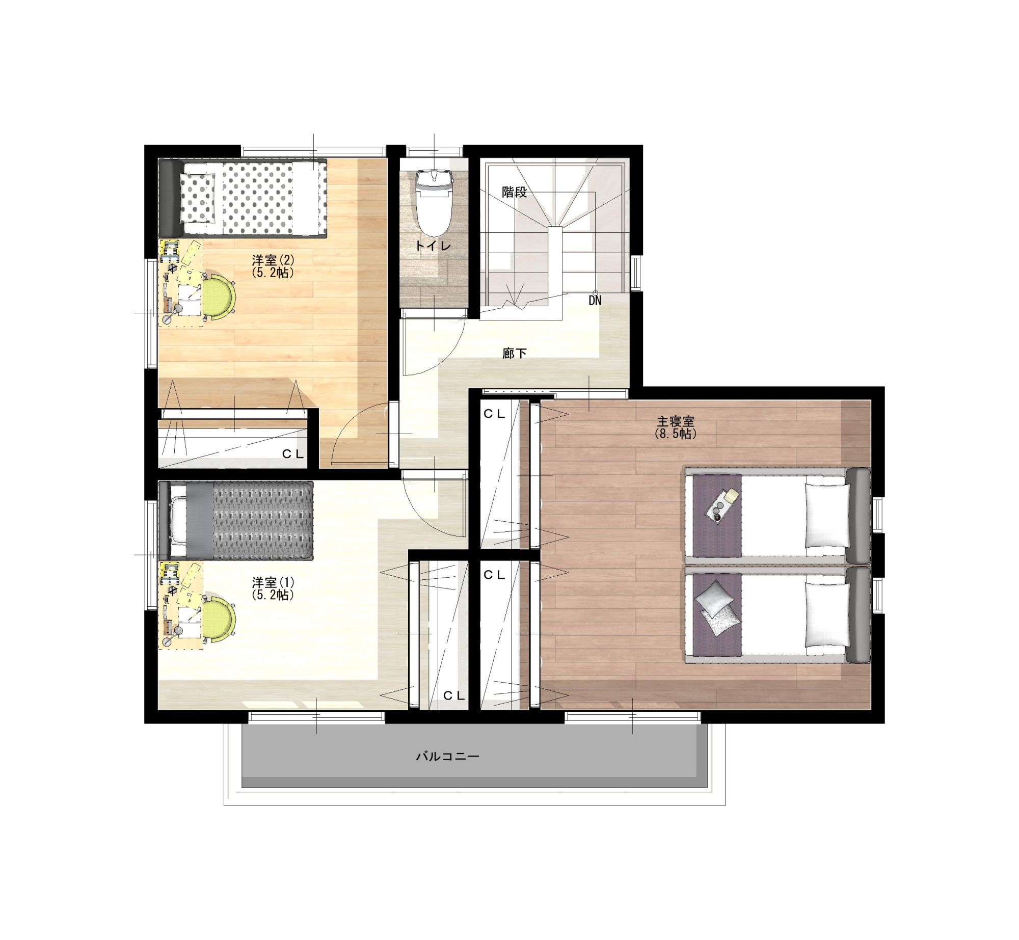 3LDK+畳コーナー。必要なものがぎゅっと詰まった4人家族にぴったりの間取りで、暮らしやすいコンパクトな生活動線が魅力です。階段下収納やパントリーなど、各所に収納を備え、すっきりと整理整頓しやすい!