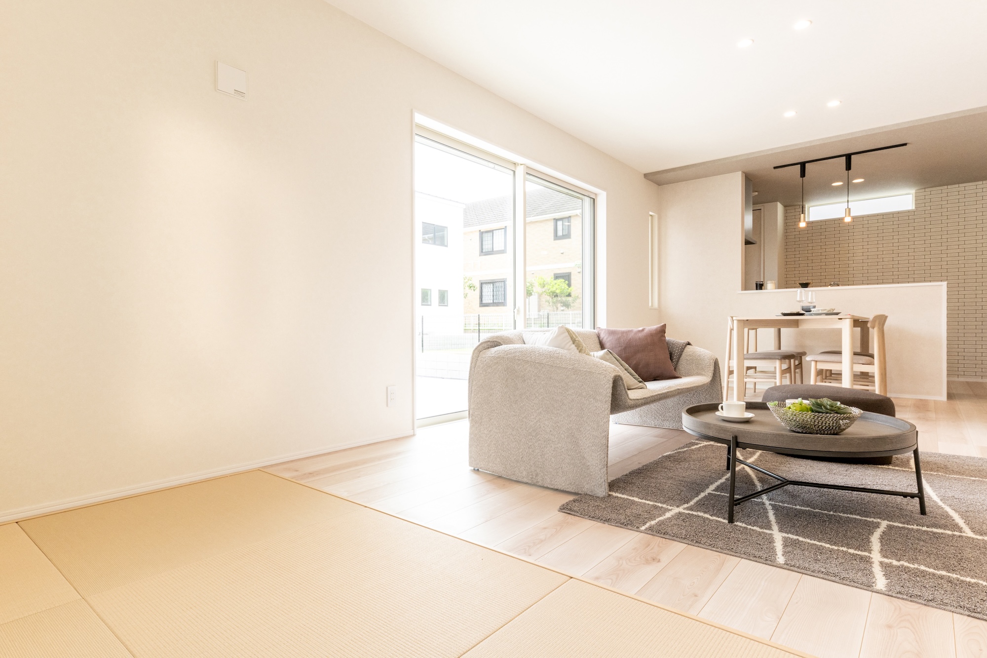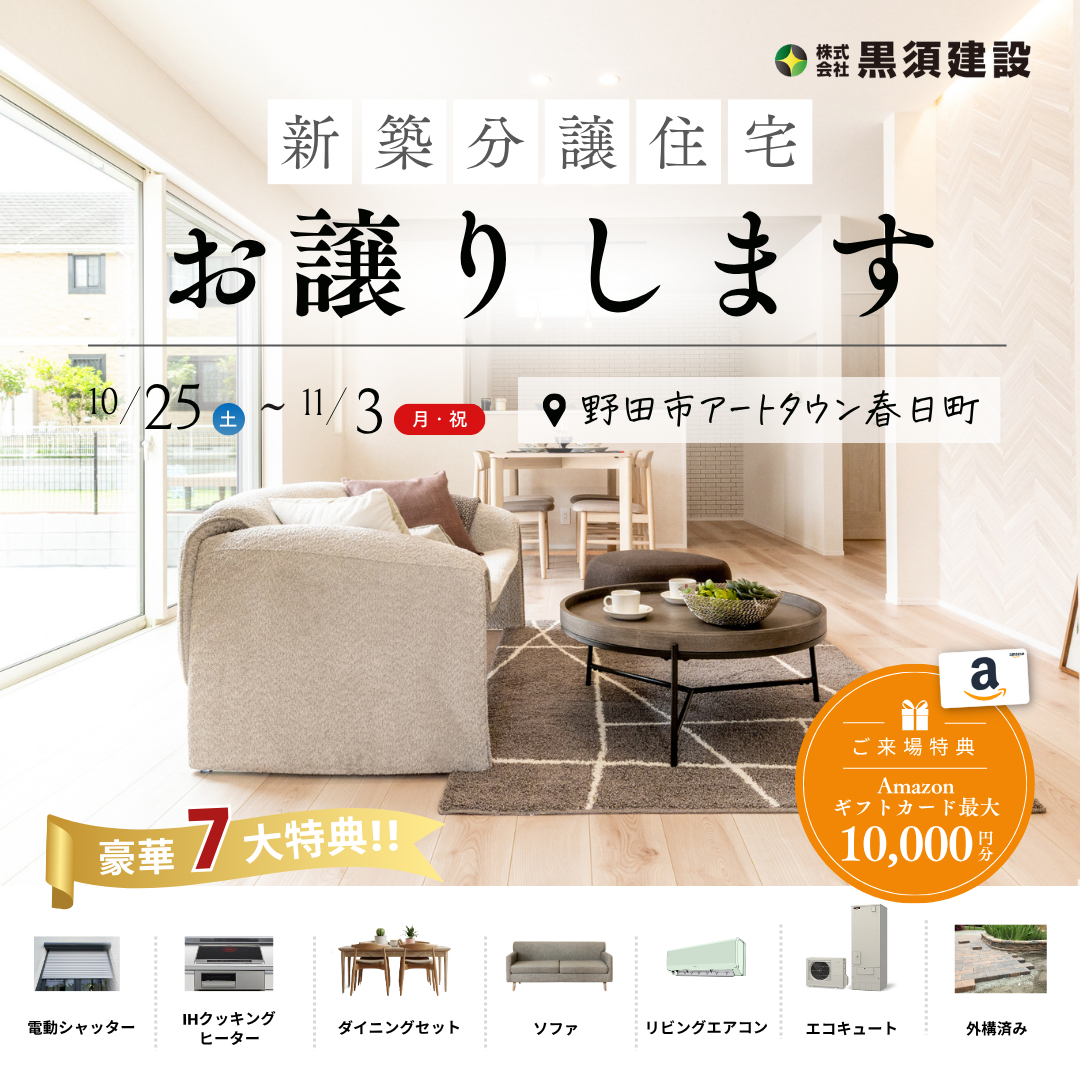 ①電動シャッター ②IHクッキングヒーター ③ダイニングセット ④ソファ ⑤リビング ⑥エアコン ⑦エコキュート ⑧外構の豪華7大特典付きで、すぐに暮らし始めることができます。電動シャッターは後から取り付けると意外と費用がかかるもの。最初からついていると安心です。
