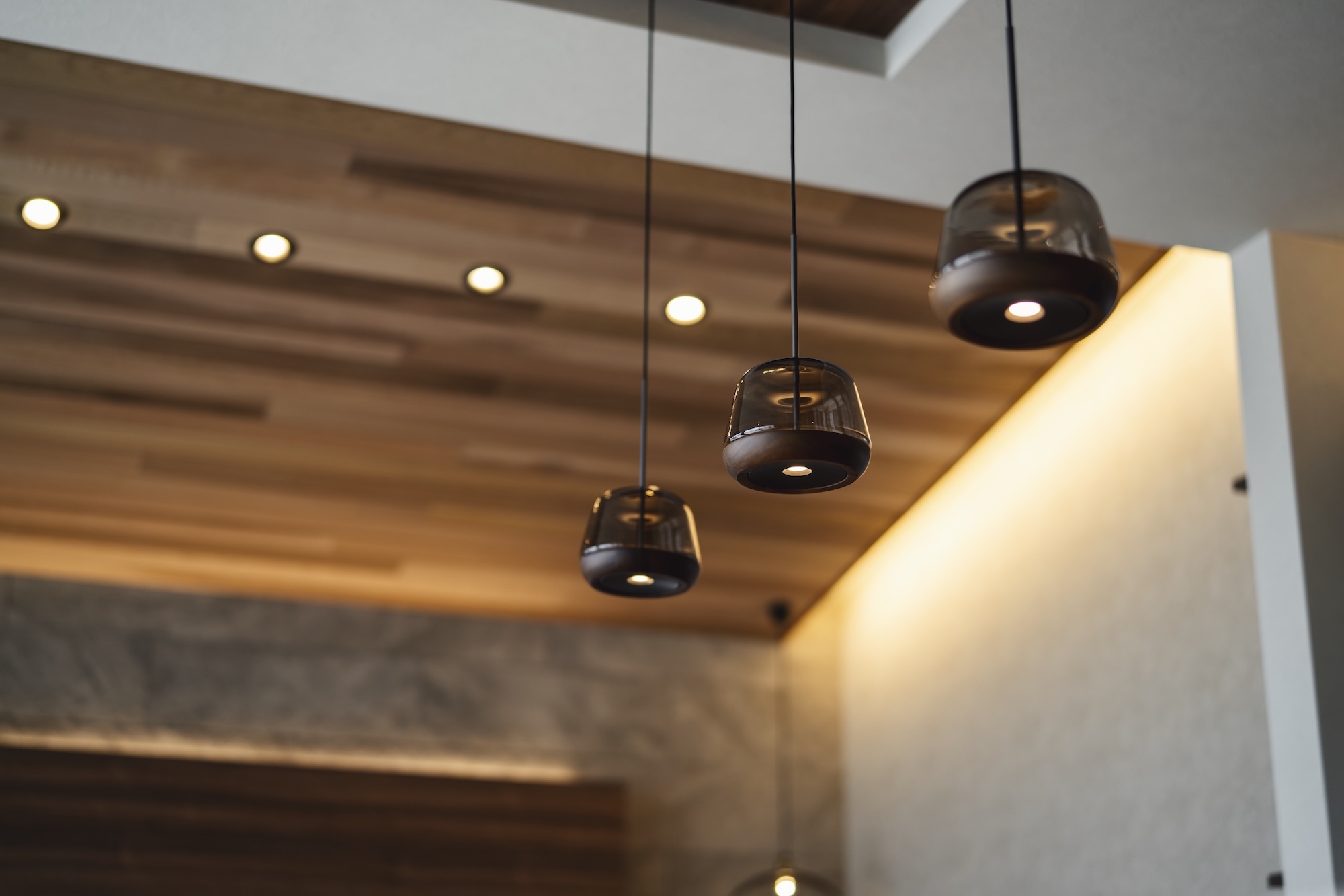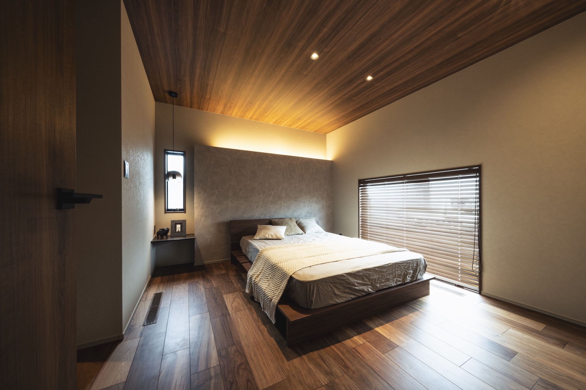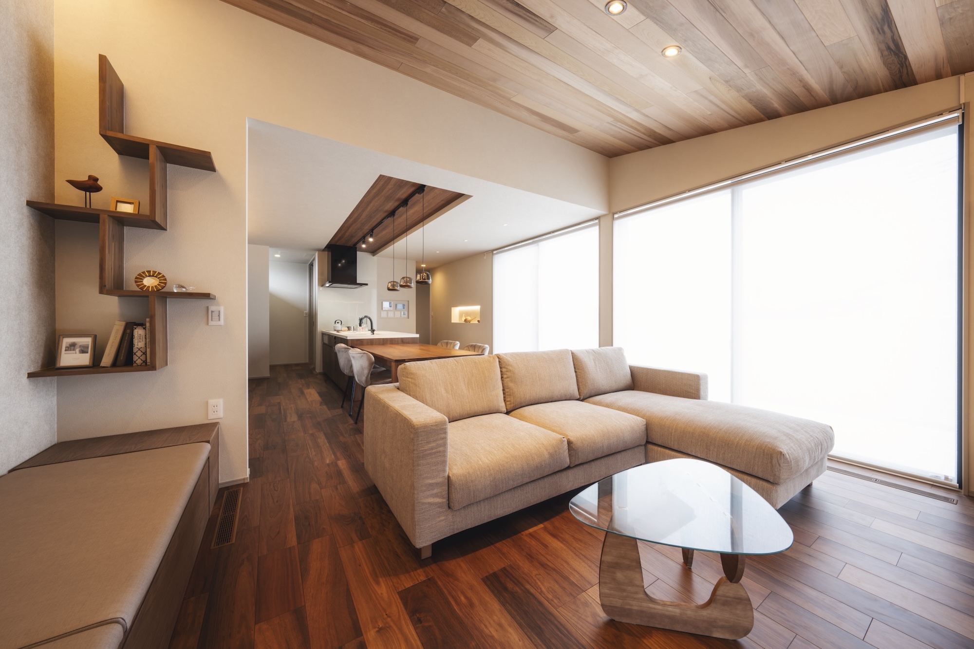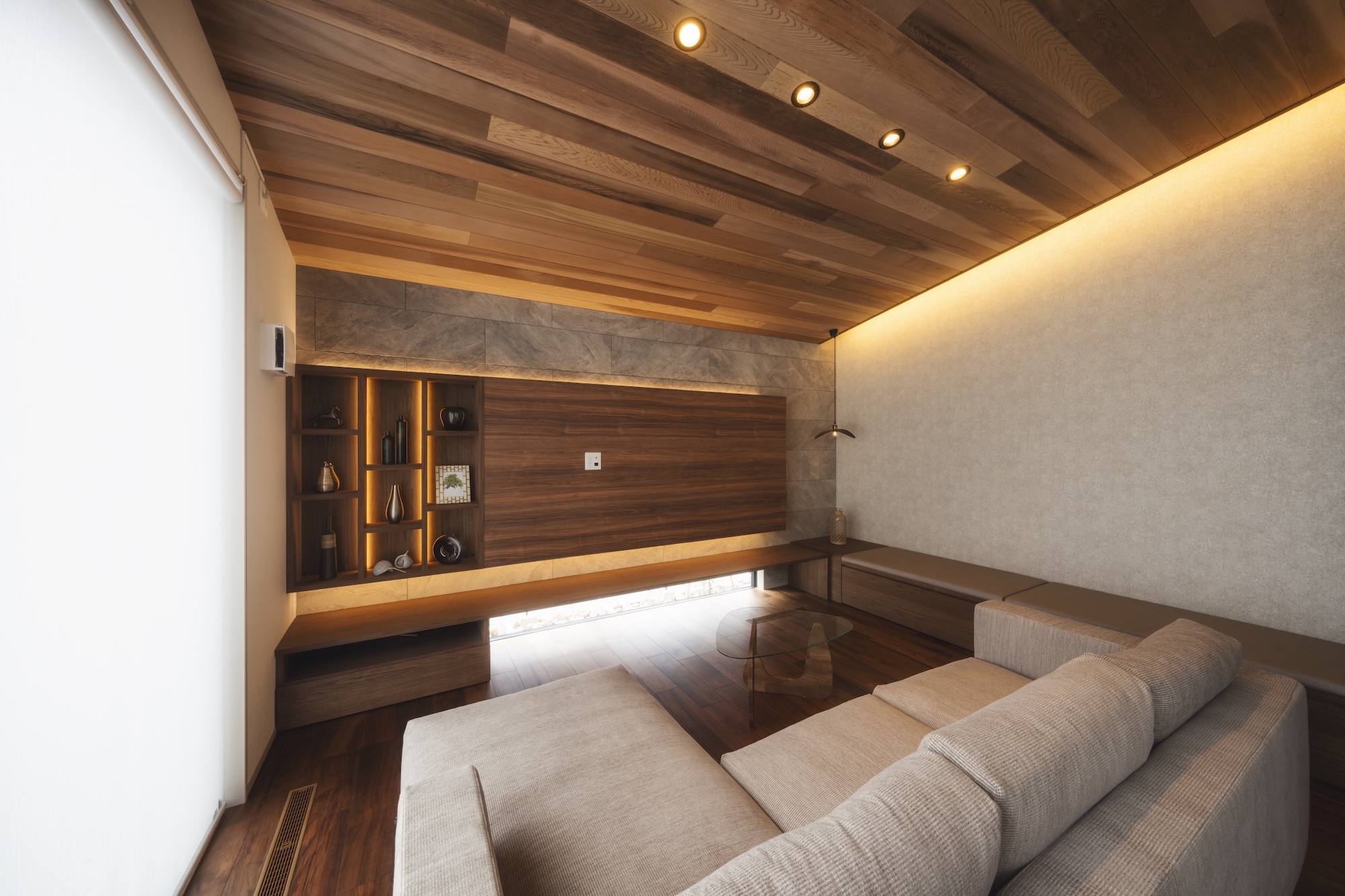 リビングの天井には、赤みを帯びた美しいブラウンが魅力のレッドシダーの無垢材を使用。やわらかな間接照明の光と調和し、心地よいぬくもりを感じられる空間を演出します。