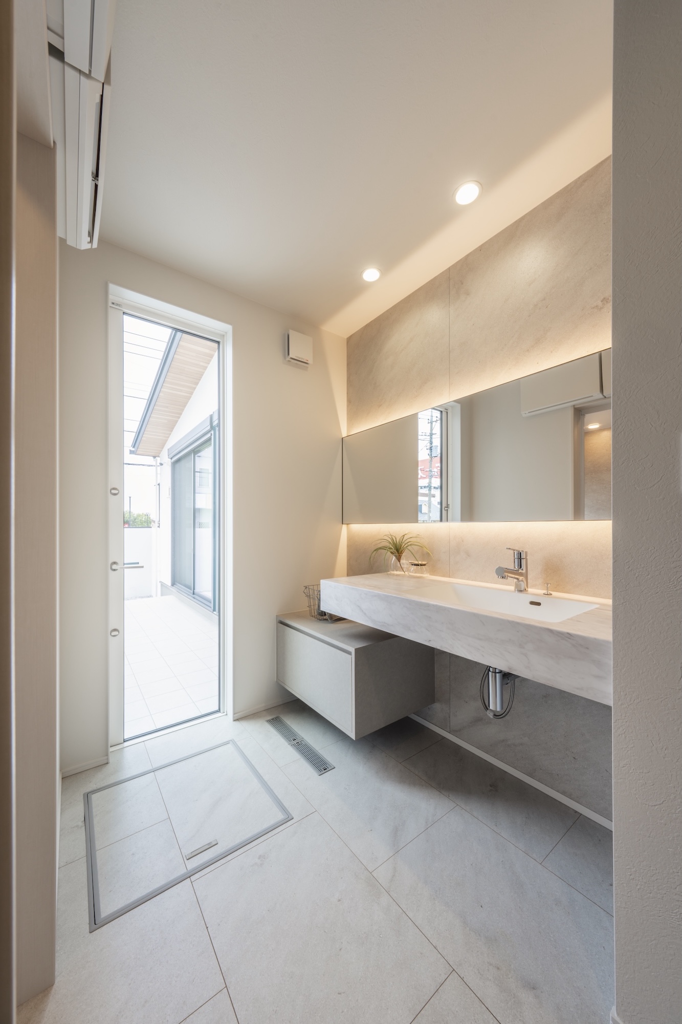 洗濯機を置く洗面脱衣室はタイルデッキと直結しており、洗濯物を干すまでの動線も快適です。重たい洗濯物を持って家の中を移動する必要がなく、日々の家事をやさしくサポートする家事ラクな間取りです。