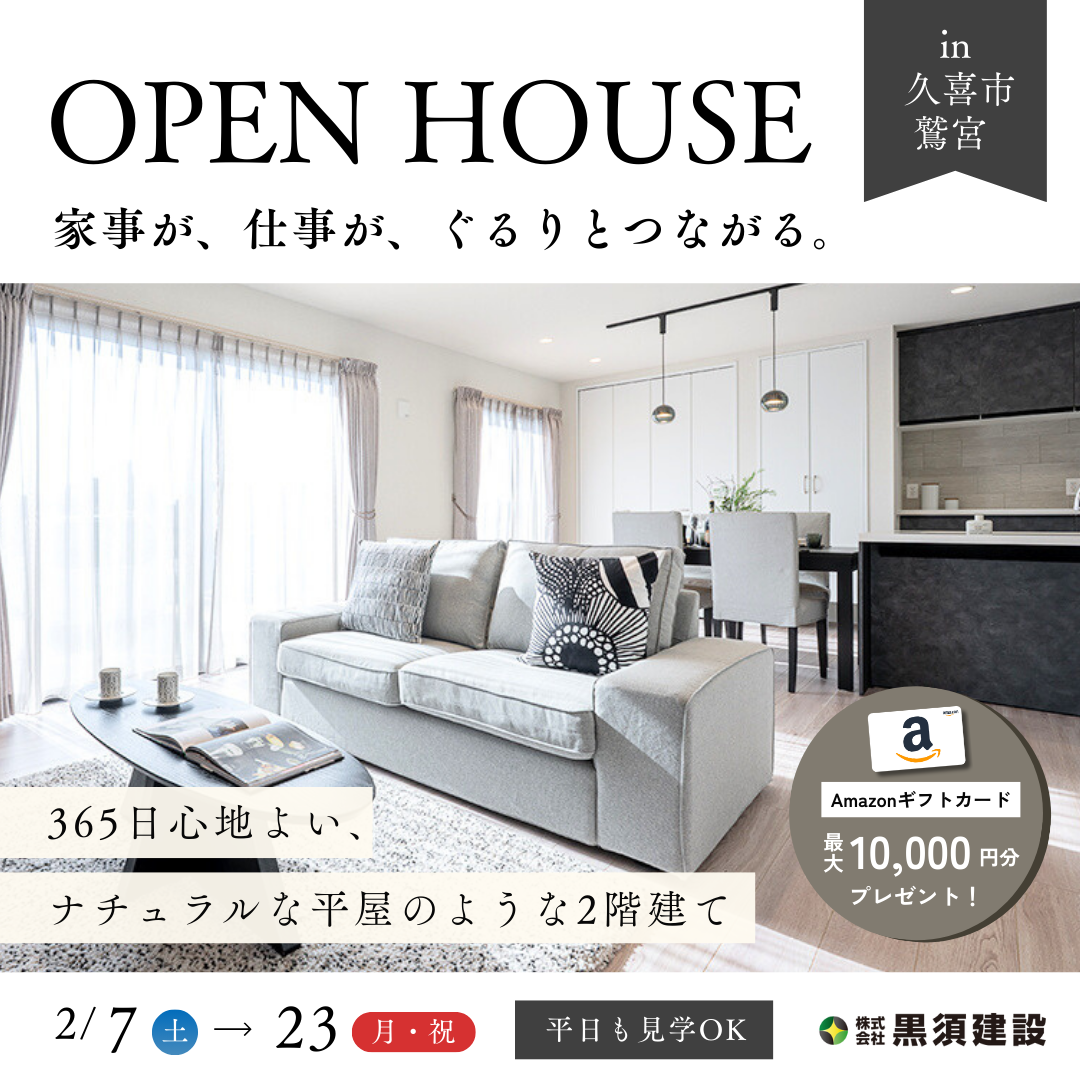 こちらの会場を見られるのは2/7(土)~23(月・祝)の間だけ。寒さの厳しい2月は、黒須建設の家の性能の高さを実感するのに最適な季節です。ぜひご家族でご見学ください。