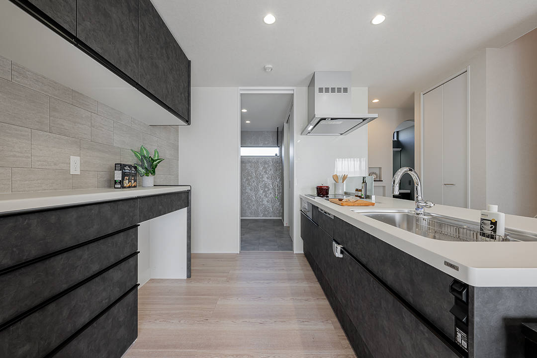 キッチンを中心に、ランドリールームから洗面室、脱衣室、玄関ホール、リビング、ダイニングへと回遊できる便利な動線設計。