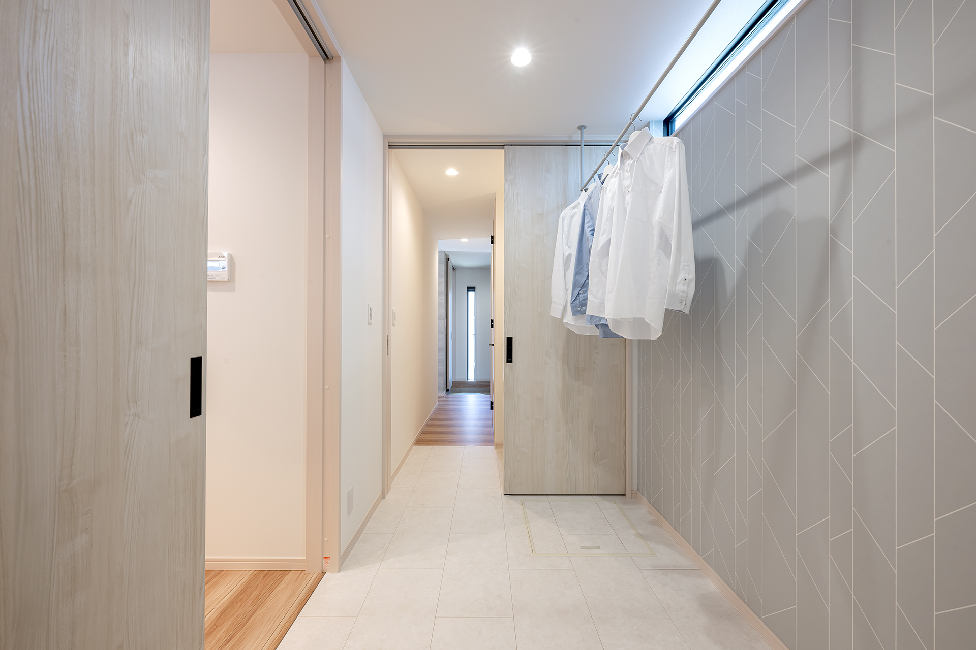 ランドリールーム・洗面室・脱衣室・バスルームが一直線につながる、コンパクトで使い勝手のよい水まわり動線。キッチンからも近いため家事の移動が少なく、毎日の作業がぐっと効率的になります。