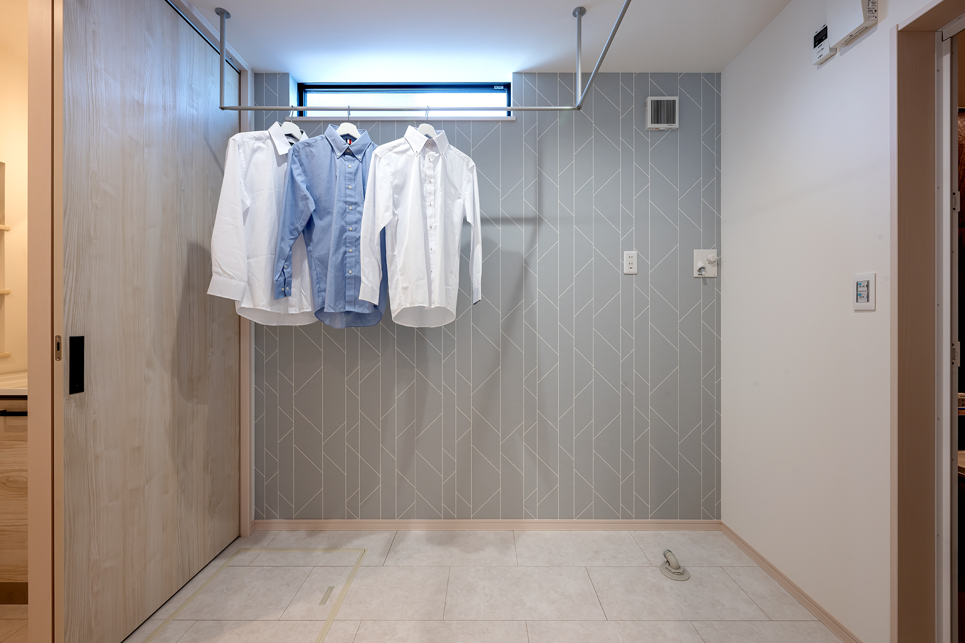 3帖の広々としたランドリールームには、洗濯機や室内干しスペースに加えてガス衣類乾燥機「乾太くん」も設置。洗濯の流れがこの一室でまとまり、毎日の家事がスムーズになります。
