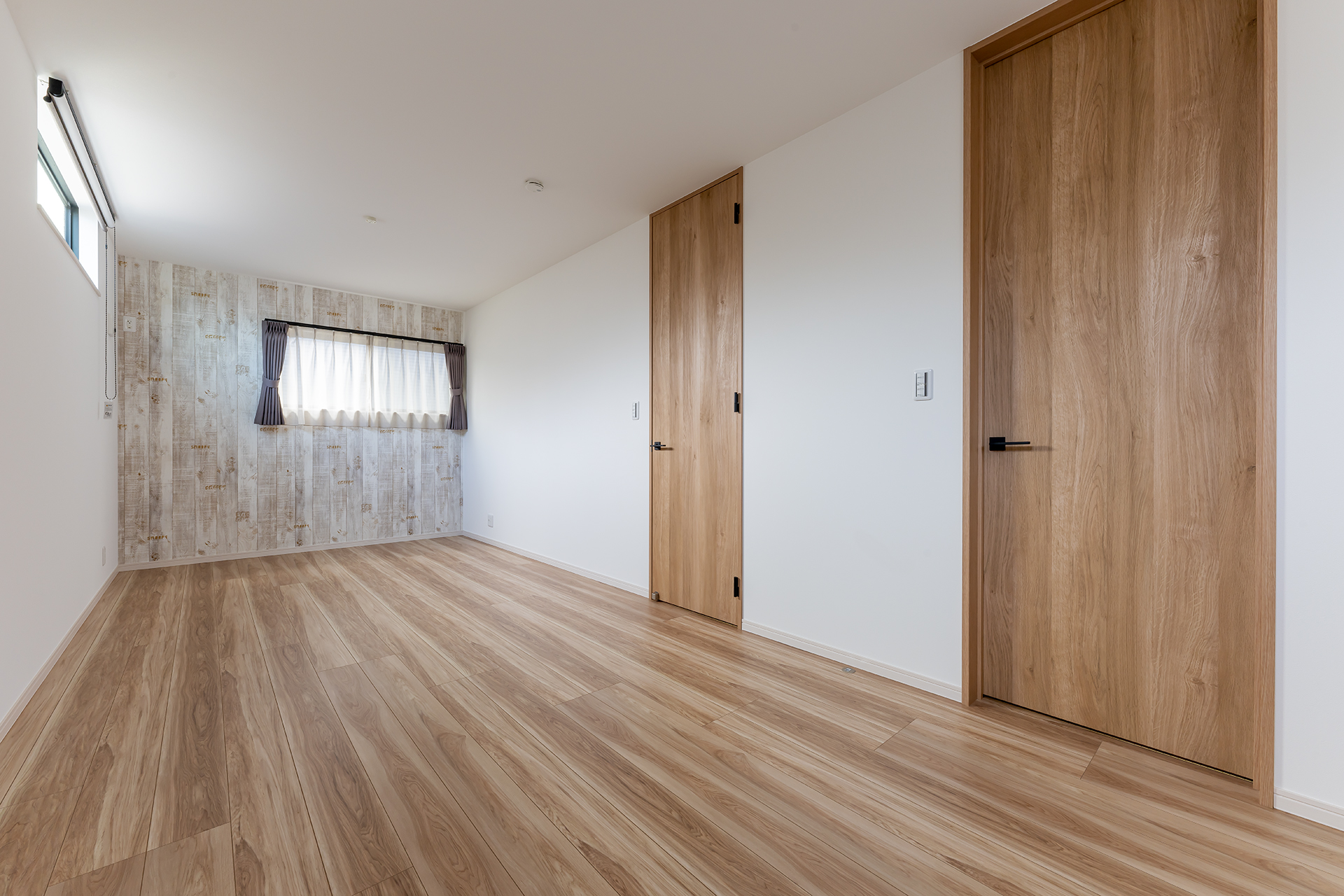 2階の大きな洋室は、クローゼット・窓・ドアが3つずつ用意してあり、将来は間仕切りで3つの子ども部屋にできるよう設計されています。