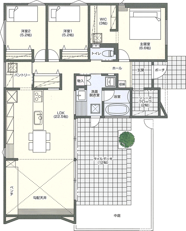平屋ならではのゆとりある暮らし。無垢材や塗り壁の温もりある空間に、自然素材に包まれた、光と風を楽しむ中庭風テラスのある広い庭。太陽光発電+蓄電池+全館空調システム搭載。IoT搭載で今も未来も快適・安心な暮らしを叶えます。